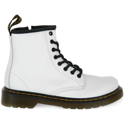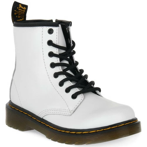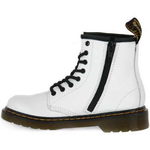 Bottines Dr Martens Junior en cuir robuste et souple avec une bride arrière avec logo et une fermeture éclair à l’intérieur pour un ajustement plus rapide. Couleur blanche.