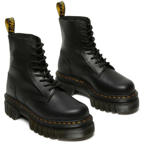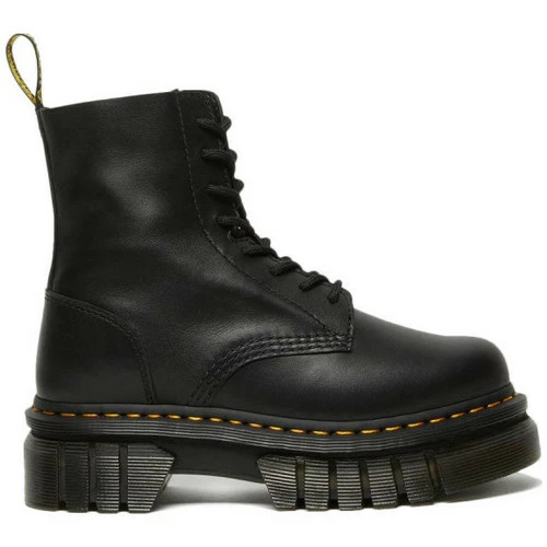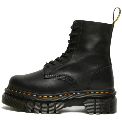 Botte Dr Martens AUDRICK PLATFORMES – Réf. 27149001. Couleur : Noir. Détails. – Tige en cuir. – Motif de bande de roulement DMS. – Boucle de talon aérien scriptée. – Semelle intermédiaire EVA. – Semelle extérieure en PVC.